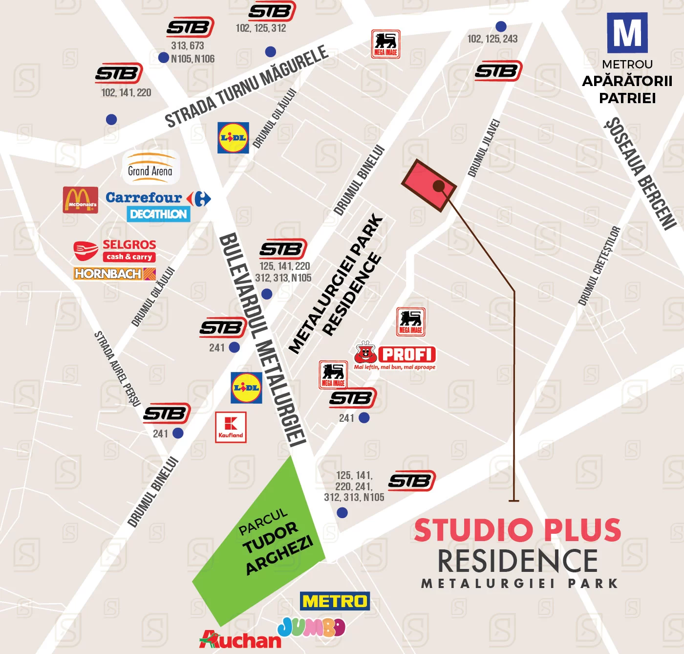 Noul ansamblu rezidential Studio Plus Metalurgiei Park este situat in Sectorul 4 al Capitalei, pe Strada Drumul Jilavei, in zona marilor centre si galerii comerciale din aceasta noua zona rezidentiala.